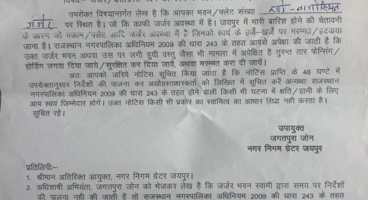 आयुक्त डॉ. गौरव सैनी ने कहा कि शहरवासियों की सुरक्षा हमारी सर्वोच्च प्राथमिकता है। बारिश के दौरान जिन भवनों को खतरा माना जा रहा है, उन पर तुरंत कार्रवाई की जा रही है। साथ ही अनाउंसमेंट और मुनादी के जरिए आमजन को सतर्क रहने की अपील की जा रही है।