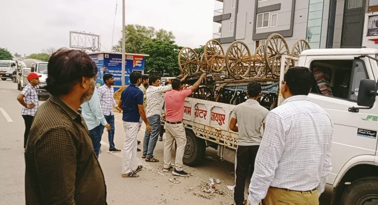 जयपुर, 04 अगस्त 2025 (न्याय स्तंभ)। नगर निगम ग्रेटर आयुक्त डॉ. गौरव सैनी के निर्देशानुसार उपायुक्त सतर्कता अजय कुमार शर्मा के नेतृत्व में सोमवार को सतर्कता शाखा की टीम द्वारा नगर निगम जयपुर ग्रेटर के क्षेत्राधिकार में अपेक्स सर्किल, रामनगरीया रोड, विधानी रामचन्द्रपुरा, पन्नाधाय सर्किल, सेक्टर 35 प्रतापनगर, सांगानेर सब्जी मण्डी, टोंक रोड़, गांधी नगर मोड से नगर निगम ऑफिस तक, राजापार्क में गली नं. 6 पर अस्थाई अतिक्रमण करने वालों के विरुद्ध कार्रवाई करते हुये 5 ट्रक सामान जब्त किया गया।